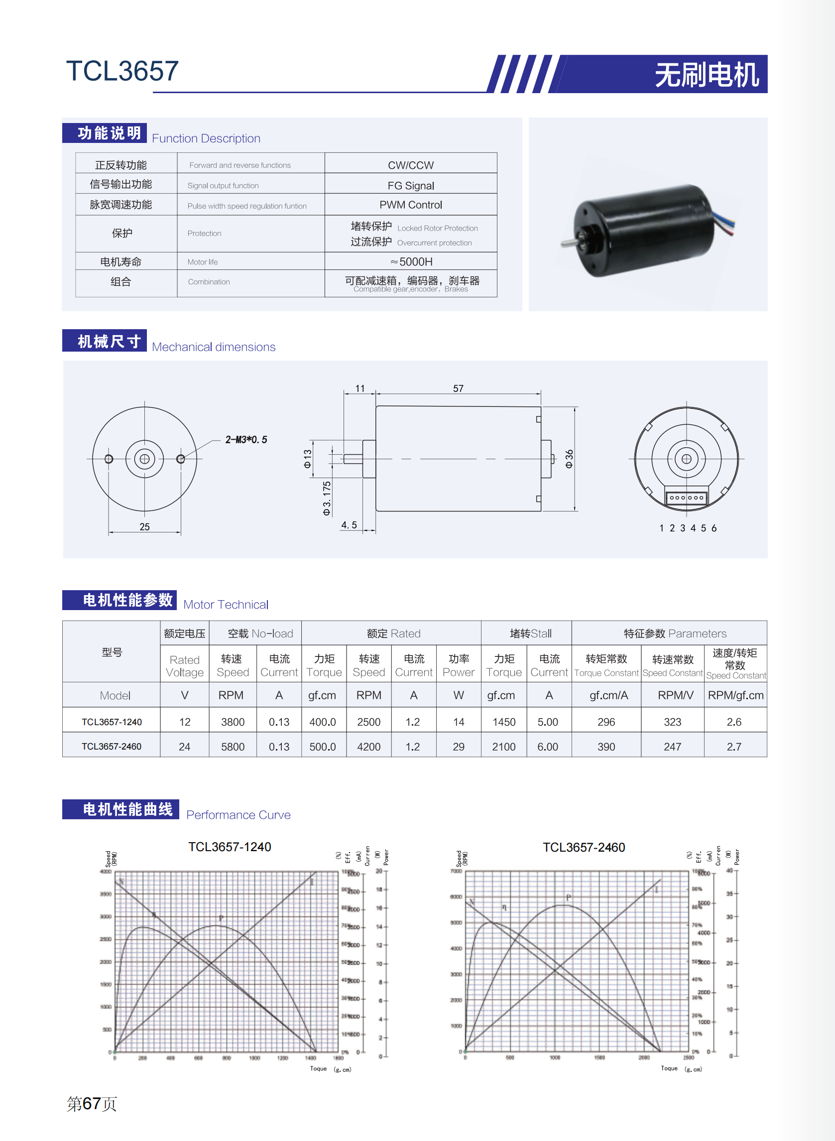 TCL3657無刷電機(jī)是一種型號(hào)的無刷直流微型電機(jī),它的外徑為36毫米,長度為57毫米。這種電機(jī)具有高效能、低噪音、長壽命等優(yōu)勢,并且采用內(nèi)置霍爾驅(qū)動(dòng)板,可PWM速度調(diào)節(jié),F(xiàn)G速度反饋輸出,有堵轉(zhuǎn)保護(hù)和內(nèi)部欠壓保護(hù)及過溫保護(hù)功能。它的常見參數(shù)包括:額定電壓12V-24V,空載轉(zhuǎn)速5800rpm/min,空載電流0.13A,堵轉(zhuǎn)扭矩155g.cm,額定功率14-19W。這種電機(jī)被廣泛應(yīng)用于電子鎖、機(jī)器人、個(gè)人護(hù)理、電動(dòng)工具等領(lǐng)域。